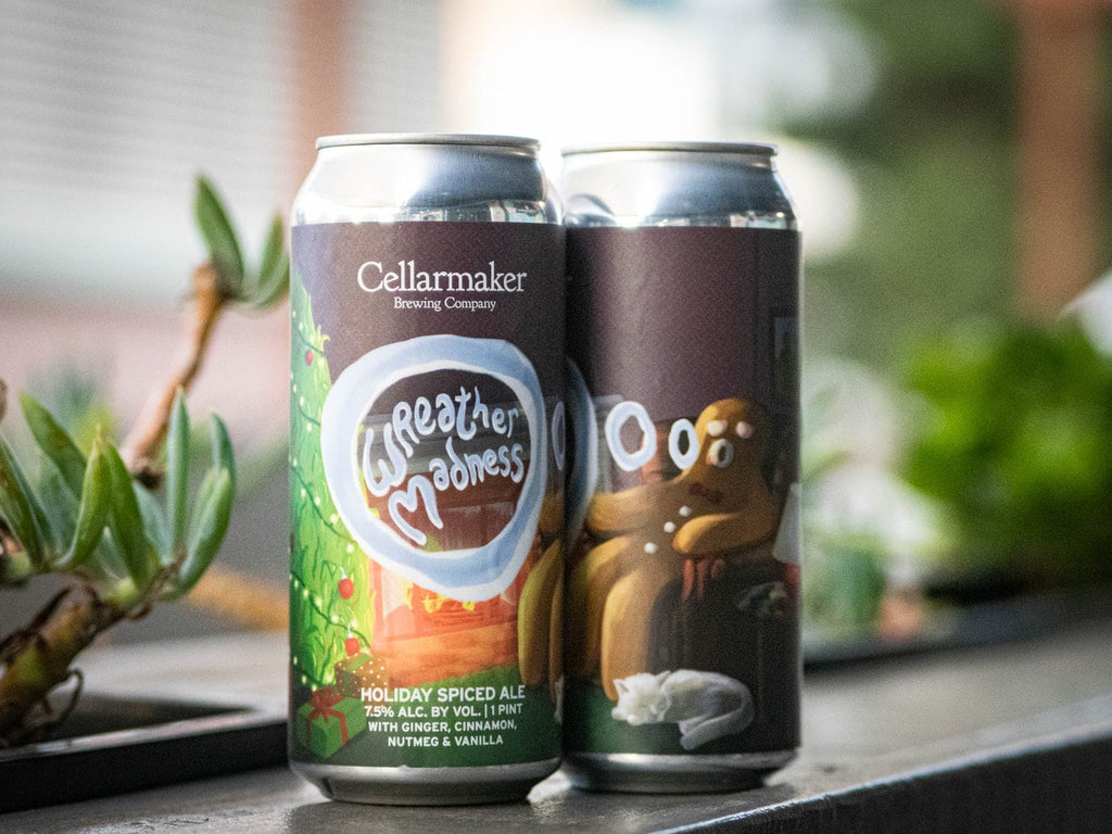 Seasons greetings from Cellarmaker! That’s right, we are getting festive up in here and to show you we mean business we bring you Wreather Madness, our Holiday Spiced Ale. This malty brew has notes of gingerbread and mulled cider from various rich barley malts and spice additions of cinnamon, nutmeg, ginger and vanilla. This is a easy drinking ale designed to help celebrate the giving spirit of the Holidays
