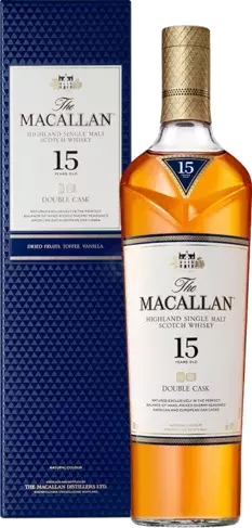 The first Double Cask 15 Year Old ever released. Aged for a minimum of 15 years, matured exclusively in handpicked sherry seasoned European and American Oak Casks. Naturally derived color from only The Macallan's exceptional oak casks. The perfect balance of classic Macallan single malt style with the sweet interlude of American Oak.